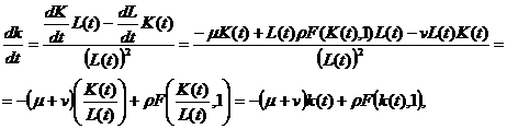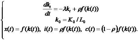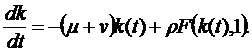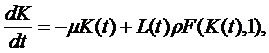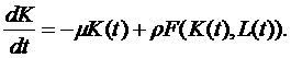 Нехай за рік вибуває (зношується і приходить в непридатність) частина μ основних виробничих фондів, норма накопичення становить ρ, а річний валовий внутрішній продукт визначається лінійно-однорідною неокласичною виробничою функцією X = F(K, L).
