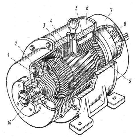 -колектор, 2-щітки, 3 і 9-сердечник і обмотка якоря, 4-головний полюс, 5-котушка обмотки збудження, 6-станина(корпус), 7-підшипниковий щит, 8-вентелятор, 10-вал.