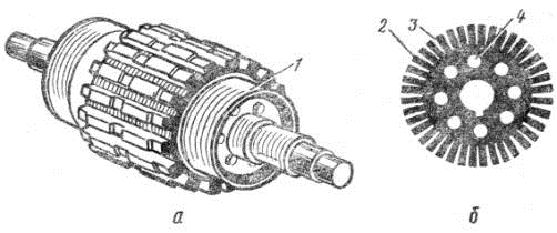 А) якір без обмотки. Б) стальний лист сердечника якоря. 1-натискні шайби, 2-зубець, 3-паз, 4-вентеляційний отвір.