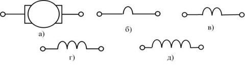 а - обмотка якоря, б - обмотка додаткових полюсів, в - компенсуюча обмотка, г - обмотка послідовного збудження, д - обмотка паралельного або незалежного збудження
