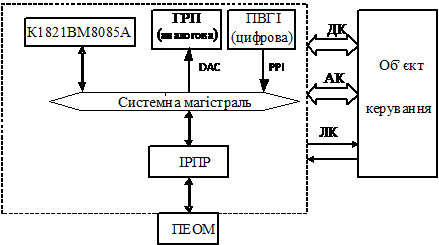 Мікропроцесорна система (МПС), що проектується, складається з таких модулів: центральний процесор (ЦП), постійний запам’ятовуючий пристрій (ПЗП), оперативний запам’ятовуючий пристрій(ОЗП), система переривань, таймер, пристрої введення-виведення (ПВВ). Пристрої введення-виведення приєднані до системної шини через інтерфейси введення-виведення.