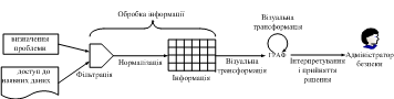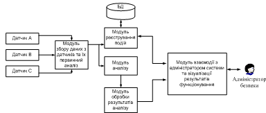Вхідна інформація поступає від датчиків моніторингу стану ІМ, потім проходить первинну обробку у блоці збору даних та їх первинного аналізу. Далі реєструються події в системі виявлення вторгнень, які за допомогою обраних методів візуалізації відображаються в блоці взаємодії адміністратора безпеки з системою та зберігаються в відповідній базі даних.