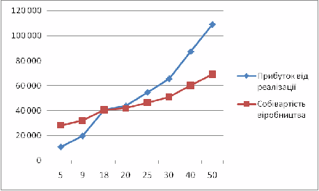 Звідси можна зробити висновок, що видавництво перестане працювати в збиток при реалізації 18-ти тисяч або більше екземплярів готової продукції - етикеток для винної пляшки. Тому поставлений спочатку план з реалізації 50 тис. екземплярів упаковок для винного виробництва повністю доцільний, однак якщо обсяг реалізації збільшити, цей проект буде ще більш прибутковим. Також побудований графік беззбитковості, з якого ми бачимо що виробництво упаковок для вино-горілчаної продукції є достатньо вигідним.