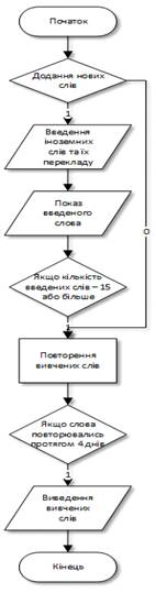 Таким чином, в другому розділі було розглянуто алгоритми побудови вхідного та вихідного інтерфейсу, а також алгоритм користування системою для вивчення іноземних слів.