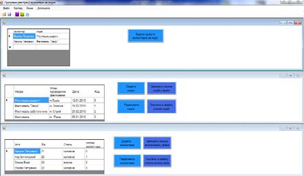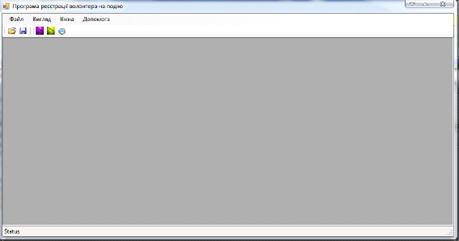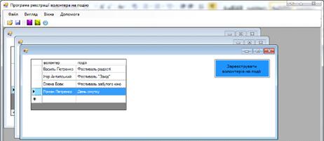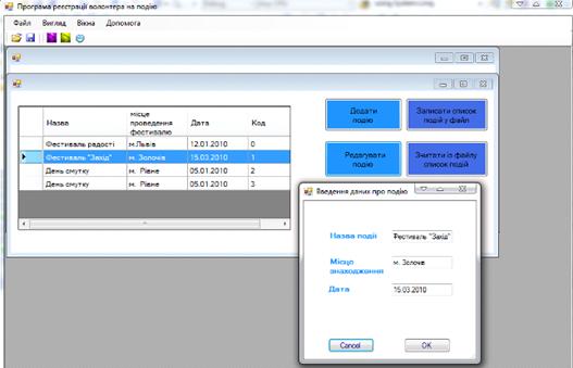 Після запуску програми добавляємо вікно «Перегляд списку волонтерів». На даній формі ми бачимо таблицю, яка містить чотири поля: «І’мя», «Вік», «Стать», «Номер волонтера», а також чотири кнопки: «Додати волонтера», «Редагувати волонтера», «Записати список волонтерів у файл», «Зчитати список волонтерів із файлу». При натисненні кнопки «Додати волонтера» ми за допомогою допоміжної форми «Введення даних про волонтерів» додаємо волонтерів. При необхідності ми можемо редагувати дані про волонтера за допомогою кнопки «Редагувати волонтера», перед тим виділивши рядок,який потрібно редагувати. Збереження даних у файл здійснюється за допомогою кнопки «Записати список волонтерів у файл», а також для зчитування даних з файлу потрібно натиснути кнопку «Зчитати із файлу список волонтерів». При добавленні форми «Перегляд списку подій» бачимо таблицю, яка містить наступні поля: «Назва», «Місце проведення фестивалю», «Дата», «Код». Для даної форми функції додавання, редагування події а також збереження даних здійснюється аналогічно до попередньої форми.