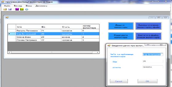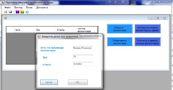 Вводимо дані про волонтера і добавляємо в таблицю при натисненні кнопки «ОК».