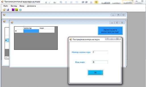 При добавленні форми «Відображення реєстрації волонтерів на події» ми бачимо таблицю з двома полями: «Волонтер», «Подія», а також копку «Зареєструвати волонтерів на події». При натисненні кнопки появляється допоміжна форма «Реєстрація волонтера на подію», яка містить два поля «Номер волонтера», «Код події», а також кнопку «ОК». При натисненні кнопки у попередню форму відображаються дані «Ім’я волонтера» і «Назва події».
