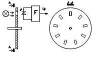 Принцип дії цього ТП засновано на перериванні освітленості робочої поверхні фотоприймача за допомогою модулятора, який має вигляд диску з виконаними в ньому радіальними отворами і який жорстко з’єднаний з валом об’єкту вимірювання. Фотоприймач освітлюється лампою через прорізі модулятора. При обертанні останнього здійснюється переривання світлового потоку, який попадає на фотоприймач (фотодіод на рисунок 1.4), в результаті чого струм фотодіоду має імпульсний характер. Формувач F перетворює імпульси струму (які мають складну форму і тривалість яких залежить від кутової швидкості) в прямокутні імпульси напруги UF калібровані за тривалістю та амплітудою. Як правило в такий ТП додатково вводять другий фотоприймач, зсунутий відносно першого на половину кута між отворами модулятору. Це необхідно для забезпечення можливості визначення напрямку обертання валу об’єкту вимірювання.