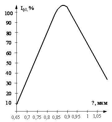 Вольт-амперна характеристика фототранзистора при різних умовах освітленості показана на рисунку 2.7, Відносну спектральну чутливість приладів ілюструє рисунок 2.8 - відношення фотоструму колектора при поточному значенні довжини хвилі випромінювання до фотоструму на довжині хвилі максимальної чутливості).