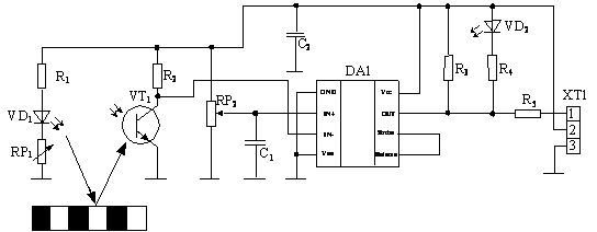 Розроблена схема працює наступним чином: коли відбитий сигнал випромінювання діода від світлої рухомої поверхні освітлює фототранзистор це спричиняє його відкривання, і як наслідок, на вхід компаратора -IN поступає сигнал логічного нуля, при цьому на вході +IN присутній деякий позитивний потенціал, значення якого залежить від положення регулювального резистора RP2, отже на виході OUT компаратора присутній сигнал логічної одиниці, тобто компаратор спрацював, це індикується згасанням світлодіода VD2. При проходженні темної рухомої ділянки випромінювання діода поглинається і фототранзистор не відкривається, в цьому випадку на вході -IN поступає сигнал логічної одиниці, при цьому на вході +IN присутній деякий позитивний потенціал але менший 5В. За таких умов компаратор закривається, та на його виході встановлюється сигнал логічного нуля, про що індикує загоряння світлодіода VD2.