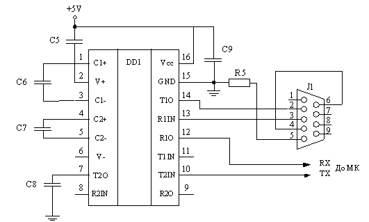 цієї мети служить мікросхема МАХ232 підключення якої зображено на рисунку 2.11.