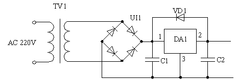 входить трансформатор, діодний міст, інтегральний стабілізатор вхідні та