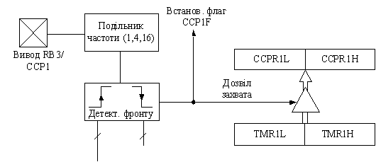При виникненні події захвата 16-розрядне значення лічильника TMR1 передаються в регістри CCPR1L: CCPR1H модуля CCP1. Подією захвата можуть бути: