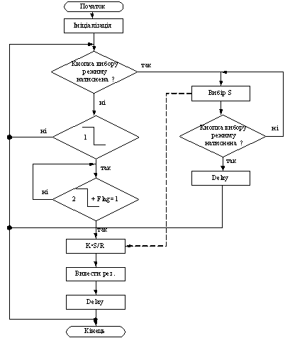 Після проведення ініціалізації проводиться сканування стану кнопки вибору режиму при ненатисненій кнопці проводитьсь індикація та вимірювання з коефіцієнтом корекції 1 при натисненні кнопки вибору здійснюється перехід в меню вибору коефіцієнта корекції в залежності від кількості секторів. Вимірювання здійснюється по другому задньому фронту інформаційного сигналу.
