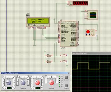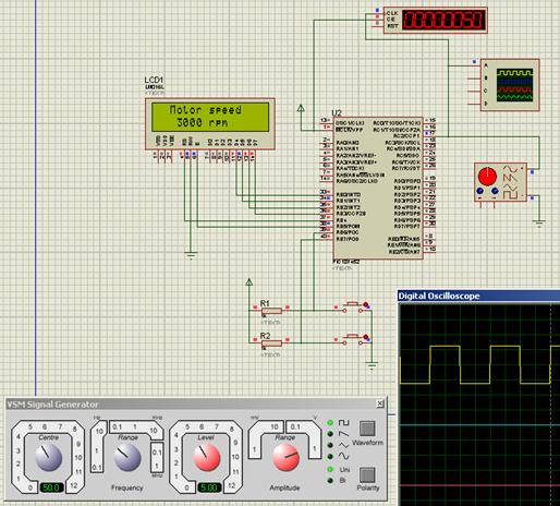 Рисунок 4.3 - Моделювання вимірювального каналу швидкості обертання вала двигуна в симуляторі Proteus Professional 7.2 при частоті