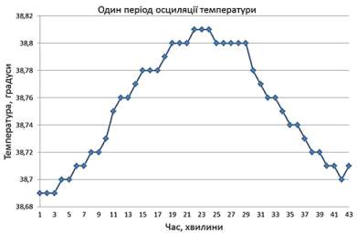 Графік зміни температури середовища культивування ОКК з 40-хвилинним періодом її осциляції в термоосциляторі