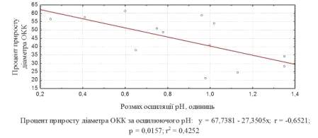 процента приросту діаметра ОКК від величини розмаху осциляції рН середовища їх