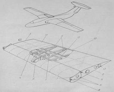 хвостові частини нервюр; 11, 12 - вузли підвіски елерона; 13 - закінцівки