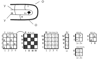 III…)- парними прокидками. Схема тканини, елементи побудови переплетення, розрізи