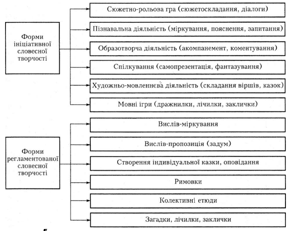У ситуаціях регламентованої мовленнєво-творчої діяльності основними організаційними формами є мовленнєве заняття, а також заняття з ознайомлення дітей із художньою літературою, деякі види мовленнєвих ігор.
