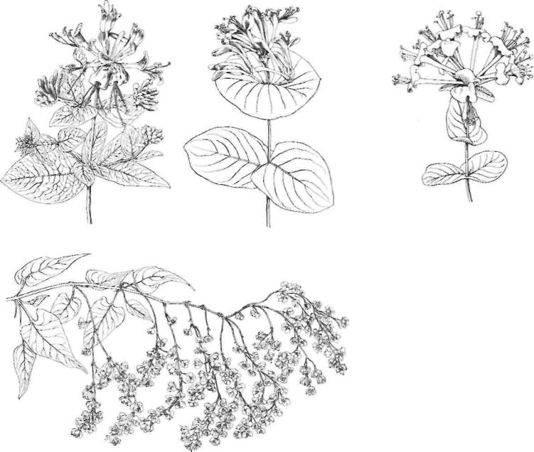 К этому физиономическому типу принадлежат жимолость Тельмана (L. tellmanniana Spaeth.). Лиана высотой до 5 м. Цветки ярко-оранжево-