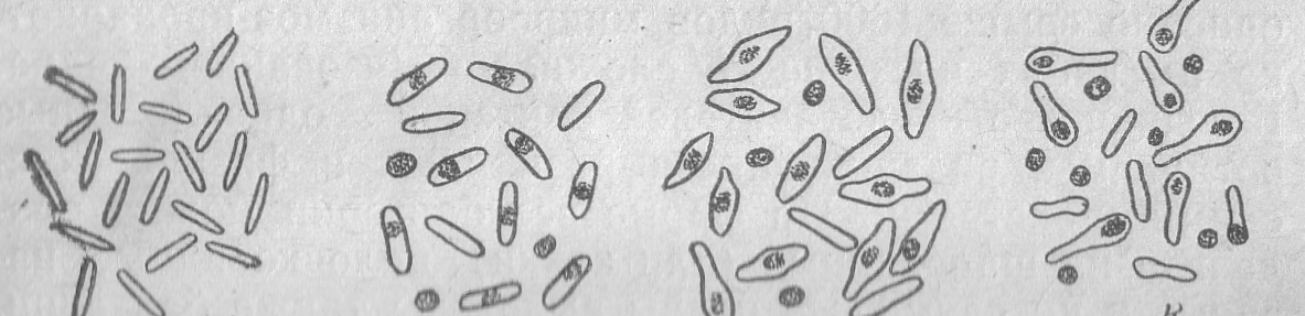 Палочки могут быть соединены попарно или в цепочки. Палочковидные бактерии бывают неспорообразующие (рис.6а) и спорообразующие (рис.6 б, в, г). Среди палочковидных бактерий есть подвижные и неподвижные формы. Неспорообразующие палочковидные бактерии грамотрицательные (за исключением палочковидных молочнокислых бактерий), спорообразующие бактерии по Граму красятся положительно. Эндоспоры бактерий формируются при неблагоприятных для бактерии условиях, являются покоящимися формами и выполняют защитную функцию. Обычно спорообразование происходит при исчерпании питательных веществ в среде, а также при несоответствии температуры, рН, влажности и т.п. оптимальным условиям для развития бактерии. Цитоплазма и ядерное вещество в спорогеной зоне концентрируются и уплотняются. Проспора (уплотненное тельце) покрывается многослойной оболочкой и образуется спора. Эндоспоры отличаются низким содержанием воды. Ферменты споры находятся в неактивном состоянии. Споры в клетке могут располагаться центрально и латерально, не изменяя форму клетки. Такое расположение спор характерно для бактерий рода Bacillus (рис.6 б). Для бактерий рода Clostridium характерно изменение формы клетки (рис.6 в, г) при образовании эндоспоры, в результате клетка приобретает форму веретена или теннисной ракетки.
