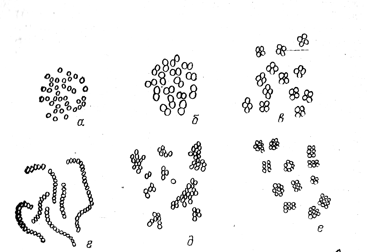 в – тетракокки; г – стрептококки; д – стафилококки;