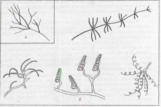 К бактериям относится еще одна, встречающаяся в пищевых производствах особая группа микроорганизмов – актиномицеты (рис.8), которые также не имеют истинного ядра. Их клетки в основном имеют вид тонких длинных прямых ветвящихся нитей (рис.8а) и по внешнему виду похожи на клетки мицелиальных грибов. Актиномицеты обитают в воде, почве, попадают на растительные остатки и зерно, придавая им специфический землистый запах. Размножаются актиномицеты с помощью экзоспор, которые формируются на концах воздушного мицелия – спороносцах, последние имеют самую разнообразную форму (рис.8б). Актиномицеты являются грамположительными бактериями.