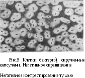 Многие бактерии образуют капсулу снаружи клеточной стенки, представляющую скопление слизистого вещества (полисахариды, полипептиды). В зависимости от размера различают микрокапсулу и макрокапсулу. При микроскопировании капсулированных бактерий капсулы имеют вид бесцветного ореола (рис.7), окружающего клетки, так как вещество капсул слабо фиксирует краситель и легко отмывается в процессе обработки препарата.