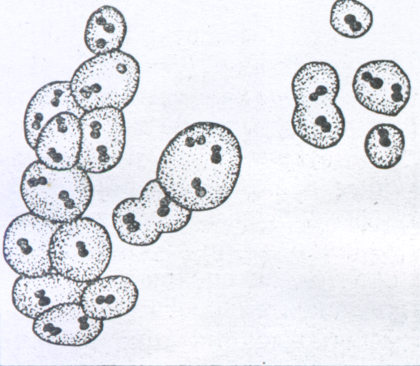Шаровидные бактерии (кокки) по расположению клеток подразделяют на микрококки – клетки, расположенные одиночно; диплококки – клетки, соединенные по две; тетракокки – клетки, соединенные по четыре в виде тетраэдра; стрептококки – кокки, расположенные в цепочки различной длины; сарцины – скопления кубической формы, напоминающие пакеты; стафилококки – скопления клеток, напоминающие грозди винограда.