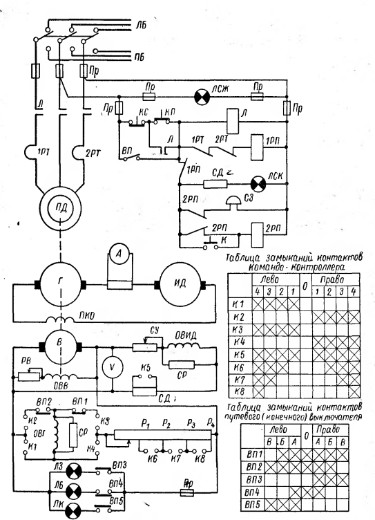 Командоконтроллер с контактами К1-К8 подобран на центре положения работы (лево и право). Сопротивления P1 - P2 подобраны регулировочные, CD - добавочное. Выключатели ВП3 - ВП5 подобраны для включения сигнализации лампами Л3, ЛБ, ЛК о положении пера руля. Конечные выключатели ВП1, ВП2 - для отключения возбуждения генератора в предельных положениях пера руля.