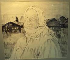 тщательно выписывает рисунок бревенчатых стен и узоры на платке старухи, цветом