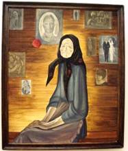 пожилая женщина, оставшаяся одна. Позади, на стене, - портреты мужа, погибшего