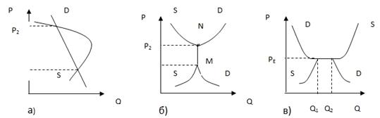 На рис.2.3 а) линия спроса имеет нормальный вид, то есть характерный отрицательный наклон. В то же время линия предложения меняет знак наклона при росте цены, что приводит к существованию двух положений равновесия - в точках E1 и E2.