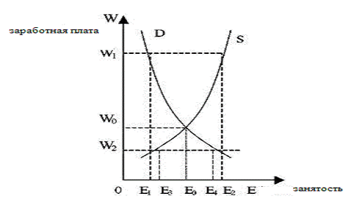 Согласно классической модели, представленной на графике (рис. 1), в точке пересечения линий D и S, отражающих спрос и предложение на рынке труда, устанавливается равновесная цена труда (заработная плата W0) и определенный уровень занятости Е0. Если уровень заработной платы в силу каких-либо причин повысится с W0 до W1, то и величина предложения возрастет, т.к. на рынке труда появится дополнительное число лиц, ранее не соглашавшихся работать за заработную плату W1. Однако спрос на труд сократится, поскольку работодателям будет невыгодно нанимать рабочую силу из-за ее дороговизны. Предложение рабочей силы превысит спрос на нее, что приведет к росту безработицы. Если уровень заработной платы опустится до W2, для работодателей станет выгодно нанимать дополнительных работников, что увеличит спрос на труд. Однако предложение труда понизится за счет тех, кого не устраивает уровень заработной платы. В результате на рынке труда спрос превысит предложение, и возникнет дефицит рабочей силы. Согласно такому подходу, безработица в значительной мере носит добровольный характер, поскольку связана с нежеланием работников трудиться за недостаточно высокую, по их мнению, заработную плату. Главным фактором борьбы с безработицы выступает снижение заработной платы.