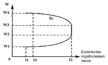 Наглядно кривая индивидуального предложения труда представлена на рисунке 1. Мы видим, что рост заработной платы с W1 до W2 приводит к увеличению числа рабочих часов с t1 до t2. Здесь преобладает эффект замещения. Кривая SL является восходящей. Дальнейший рост заработной платы с W2 до W3 не отражается на увеличении продолжительности рабочего времени, работник трудится столько же, сколько и прежде. Здесь эффект замещения равен эффекту дохода. Кривая SL является вертикальной линией. Повышение ставки заработной платы с W3 до W4 ведет к сокращению рабочего дня с t2 до t3. Здесь эффект дохода действует сильнее эффекта замещения. Кривая SL является нисходящей.