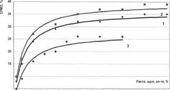 Показано, что СРМЗ в растворах щелочных электролитов, представленная в табл. З.1., составляет 27 ± 1 % для силикатов натрия, 35 ± 2 % для гидроокисей натрия и 39 ± 2 % для гидроокисей калия, то есть на степень растворения молочных загрязнений (СРМЗ) существенно влияет степень диссоциации электролитов в водных растворах (рН среды).