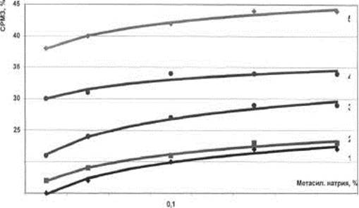 СРМЗ возрастает с повышением концентрации электролитов до 0,7 %. Дальнейшее увеличение содержания электролита в водном растворе незначительно влияет на СРМЗ, но увеличивается нецелесообразный расход ингредиента. Степень удаления молочных загрязнений гидроокисями натрия и калия на 10 - 12 % выше, чем при использовании метасиликата натрия, что объясняется более высокой степенью диссоциации их ионов.