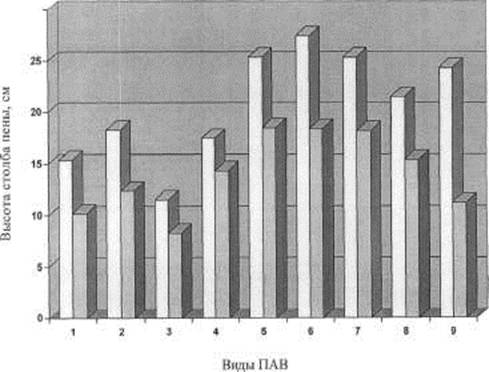 Пенообразующая способность ПАВ особенно важна при создании композиций с заданными характеристиками. Для циркуляционных систем мойки моющие средства должны быть низкопенными, а для мойки наружных поверхностей оборудования как ручным, так и механизированным способом с помощью специальных пенообразователей моющие средства должны обладать высоким пенообразованием. Поэтому нами была исследована пенообразующая способность большинства ПАВ, имеющихся на российском рынке и обладающих высокой степенью биоразлагаемости.