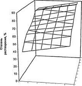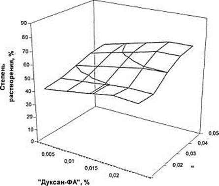 Рис. 3.12. Зависимость степени растворения молочных загрязнений от концентраций электролитов, добавки "Дуксан-ЧАС" и комплексообразователя "Дуксан-М" для высокощелочного моющее-дезинфицирующего средства.