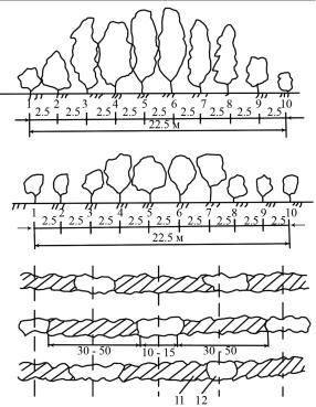 а) первый тип полос; б) второй тип полос; в) организация разрывов в полосах второго типа; 1– 10 – номера рядов полос; 11 – древесно-кустарниковый участок полосы; 12 – кустарниковый участок.