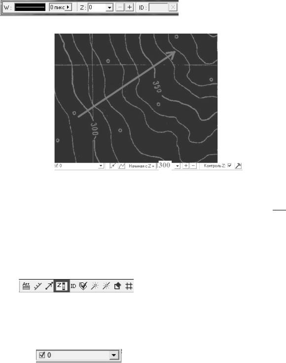 , вписываем высоту Z, с которой планируем начать проставлять высоты (рис. 10). Ставим курсор перед начальным значением Z, двигаясь от меньшего к большему значению, пересекаем как можно больше горизонталей.