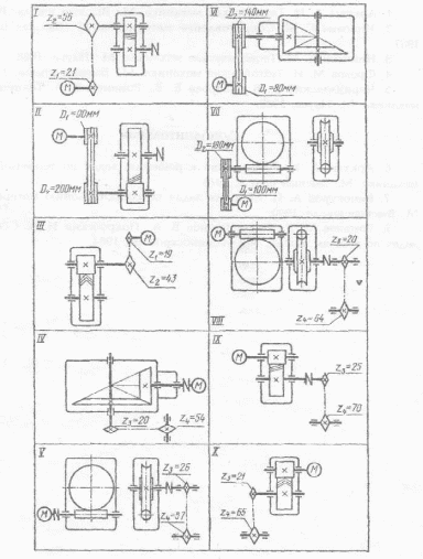 При расчете принимать следующие значения КПД передач: ηподш=0,99; ηц.п.=0,95; ηр.п.=0,96; ηзуб=0,97; ηч.п.=0,77...0,85. Следует иметь в виду, что при выборе твердости заданного материала по табл. 9.2 стр. 170 (4) и для определения допускаемых напряжений рекомендуется: при расчете прямозубых передач твердость материала шестерни брать на 20...30 единиц НВ больше, чем для колеса, т. е. принимать НВ1НВ2+(20...30), что обеспечивает лучшую приработку зубьев и примерно одинаковый износ шестерни и колеса, при расчете косозубых и шевронных передач НВ1=НВ2+(50...80), что позволяет существенно повысить нагрузочную способность этих передач. Исходные данные для Р и n и кинематическую схему необходимо выбрать по своему варианту из таблицы: