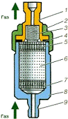 гайка, 3 - пружина, 4 - сетка, 5 - фильтр, 6 - осушающий материал, 7 - сетчатая