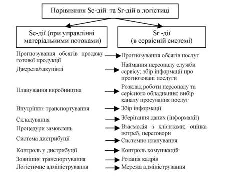 Зіставляючи Sc-дії і Sr-дії, можна зробити висновки про те, що логістичні менеджери підприємства, яке здійснює послуги, можуть використовувати ті ж принципи й методичні підходи при управлінні потоками послуг, що й для матеріальних потоків. Проте необхідно враховувати, що процедури замовлень і моніторингу послуг звичайно носять більш комплексний характер, ніж аналогічні процедури матеріального логістичного менеджменту.