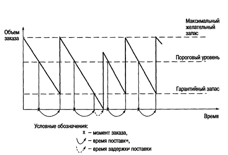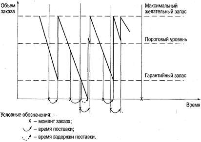 Із системи управління запасами з фіксованим розміром замовлення розглянута система запозичила параметр граничного рівня запасу. Граничний рівень запасу визначає рівень запасу, при досягненні якого проводиться чергове замовлення. Величина граничного рівня розраховується виходячи із значення очікуваного денного споживання таким чином, що надходження замовлення відбувається в момент зниження поточного запасу до гарантійного рівня. Таким чином, відмітною особливістю системи є те, що замовлення поділяються на дві категорії. Планові замовлення виробляються через задані інтервали часу. Можливі додаткові замовлення, якщо наявність запасів на складі доходить до граничного рівня. Очевидно, що необхідність додаткових замовлень може з'явитися тільки при відхиленні темпів споживання від запланованих.
