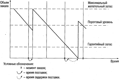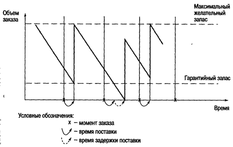Гарантійний (страховий) запас дозволяє забезпечувати потребу на час передбачуваної затримки поставки (під можливою затримкою поставки також мається на увазі максимально можлива затримка). Поповнення гарантійного запасу проводиться в ході подальших поставок через перерахунок розміру замовлення таким чином, щоб його постачання збільшило запас до максимального бажаного рівня. Графічна ілюстрація функціонування системи управління запасами з фіксованим інтервалом часу між замовленнями представлена на рис. 8.5.