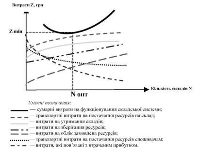 Рис.9.5. Залежність логістичних витрат від кількості складів