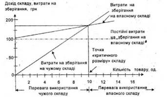 Вибір між складом загального користування й власним є одним з аспектів розв'язання завдання "зробити чи купити", отже вимагає аналізу беззбитковості. Визначення критичного розміру складу при обґрунтуванні доцільності вибору власного складу базується на розрахунку та порівнянні витрат на зберігання на власному та орендованому складі (рис. 9.4).