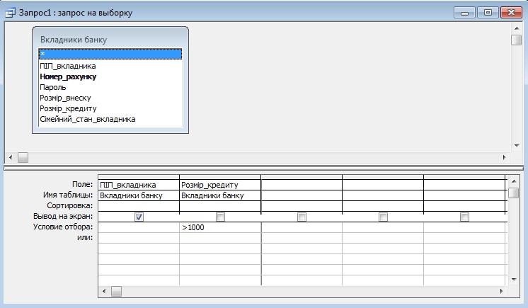 WHERE ((([Вкладники банку].Розмір_кредиту)>1000));